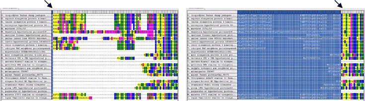 Now scroll to the right until you encounter a large conserved block, which will look like several columns with few gaps in them.